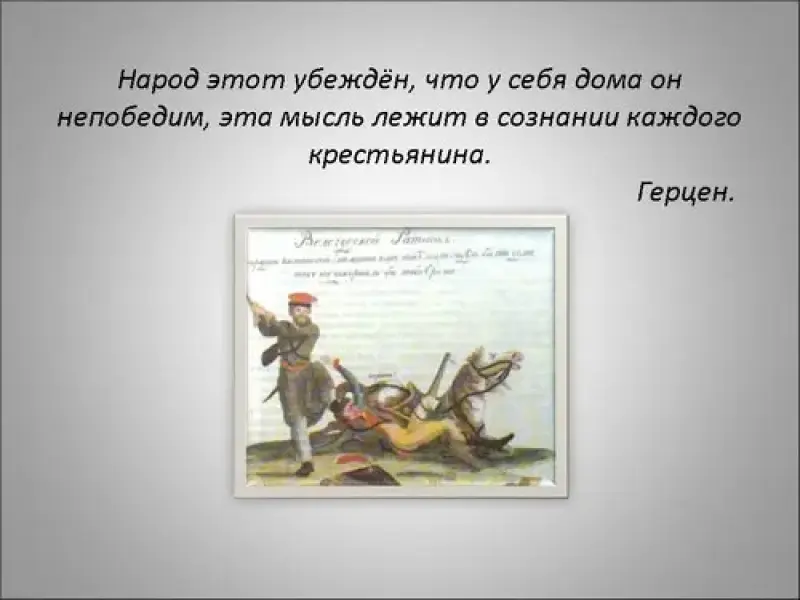 "Народ этот,- говорил Герцен,- убеждён, что у себя дома он непобедим, эта мысль лежит в глубине сознания каждого крестьянина". Слайд №3.
