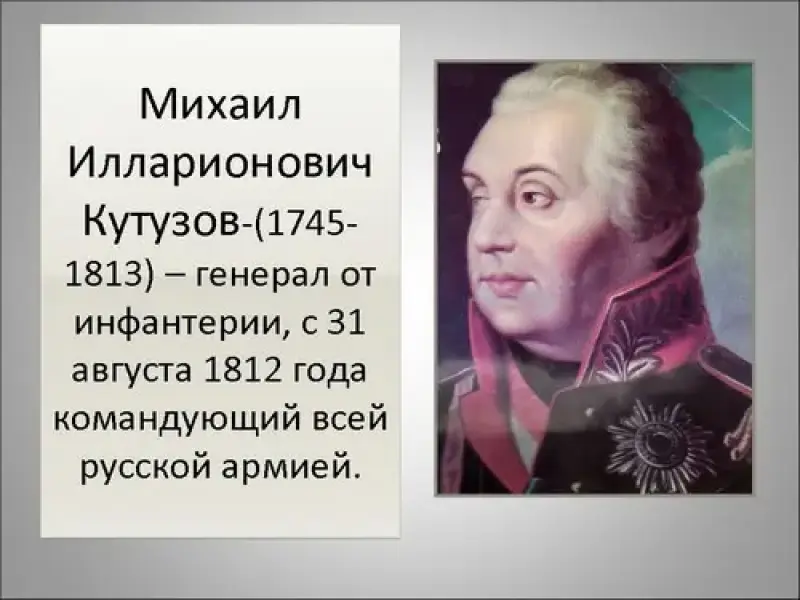 Именно в этой войне громко заявил о себе будущий победитель Наполеона - М.И.Кутузов. Слайд №4. Вот почему главные мотивы литературы тех лет - народная война с захватчиками и народный герой. "Старый лис Севера,- сказал о Кутузове Наполеон. "Умён, умён, его и сам Рибас не обманет",-отзывался о нём Суворов. А "дедушка Крылов" посвятил ему свои басни, которые сам полководец ценил более всего.