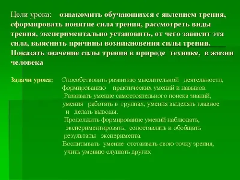 Цели урока: ознакомить учащихся с явлением трения, сформировать понятие сила трения, рассмотреть виды трения, экспериментально установить, от чего зависит эта сила, выяснить причины возникновения силы трения. Показать значение силы трения в природе технике, в жизни человека.