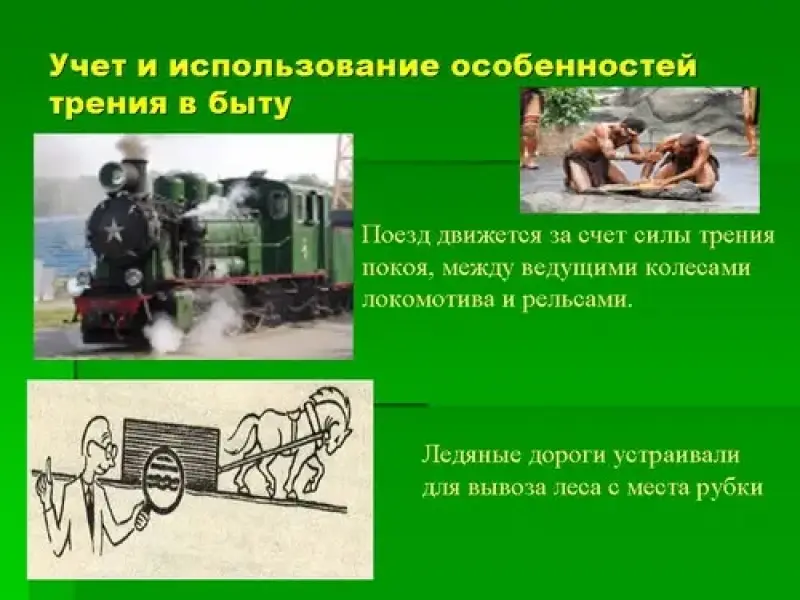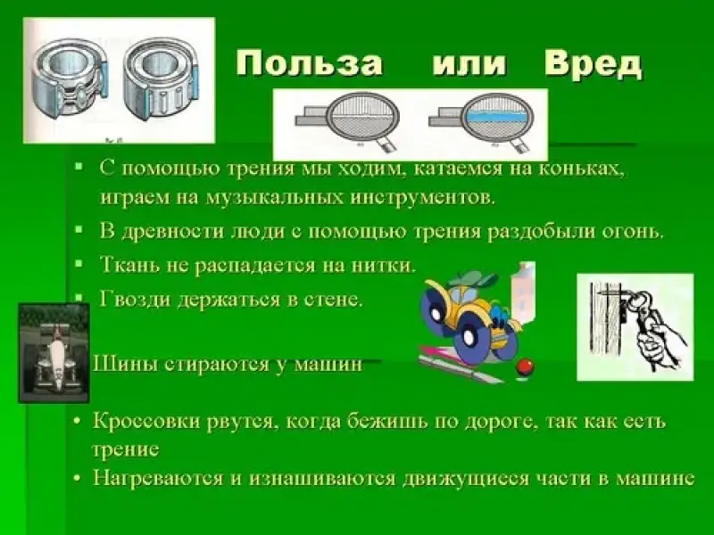 Роль силы трения: В технике и в повседневной жизни силы трения играют огромную роль. В одних случаях силы трения приносят пользу, а в других - вред. Сила трения удерживает вбитые гвозди, винты, гайки; удерживает нитки в материи, завязанные в узлы. При отсутствии трения нельзя было бы сшить одежду, собрать станок, сколотить ящик.