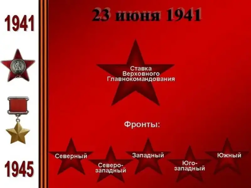 Были образованы Северный, Северо-Западный, Западный, Юго-Западный, Южный фронты. Для руководства ими 23 июля была создана Ставка Главного командования (позднее Ставка Верховного Главнокомандования), в состав которого вошли Сталин, Молотов, Тимошенко, Будённый, Ворошилов, Шапошников, Жуков. Верховным Главнокомандующим был назначен Сталин.