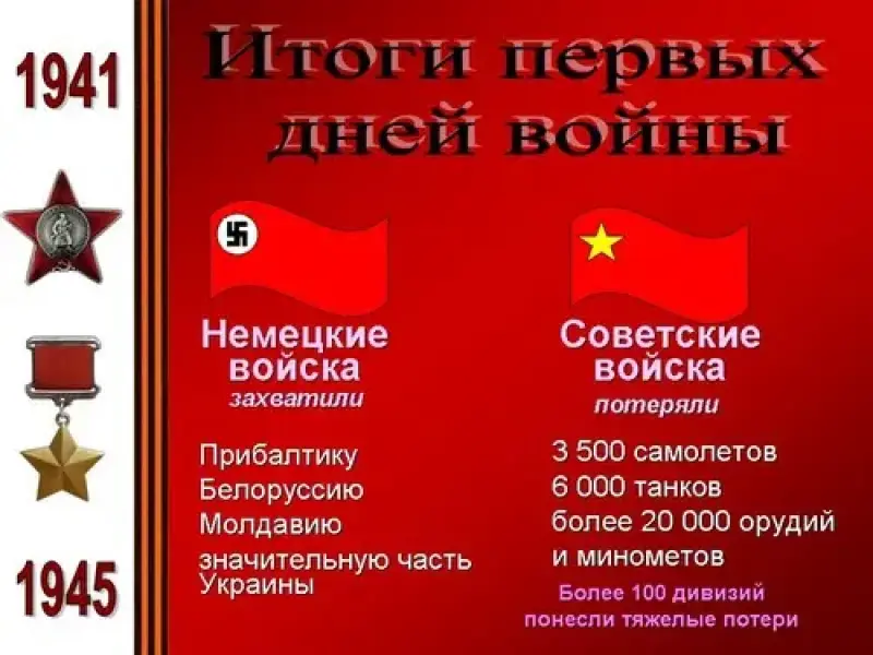 Итоги первых дней войны были ошеломляющими. Немецкие войска захватили Прибалтику, Белоруссию, Молдавию, значительную часть Украины. Советские войска потеряли 3500 самолётов, 6000 танков, более 20000 орудий и миномётов, более 100 дивизий понесли тяжёлые потери.