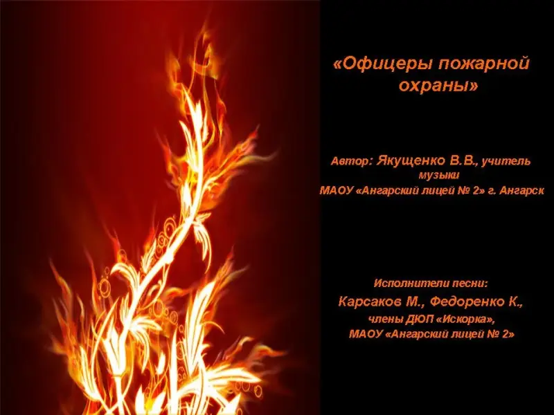 3. Музыкальная композиция "Офицеры пожарной охраны". Исполняет Карсаков Михаил, командир ДЮП "Искорка" (сопровождается слайдовой презентацией).