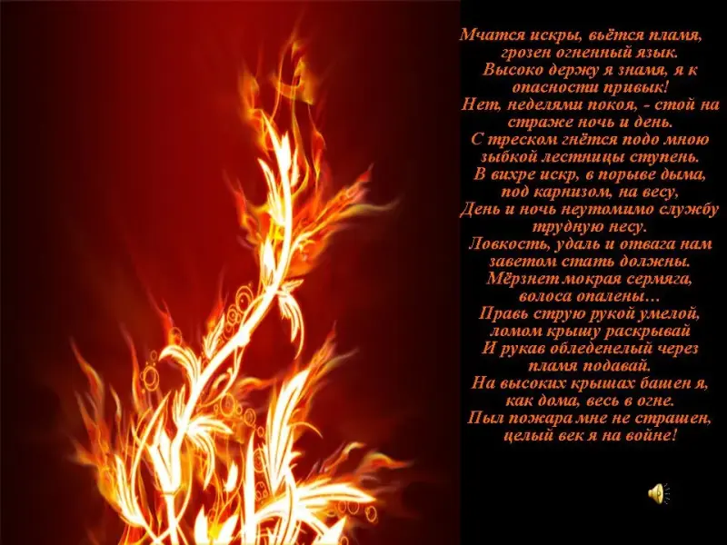 Наше мероприятие мы посвящаем людям, чей труд связан с пожарной охраной. Пожарный - это человек, который находится на трудной службе, он каждую минуту может рисковать жизнью. Один из таких людей пришёл сегодня к нам в гости. Давайте поприветствуем его и попросим рассказать о нелёгкой службе.