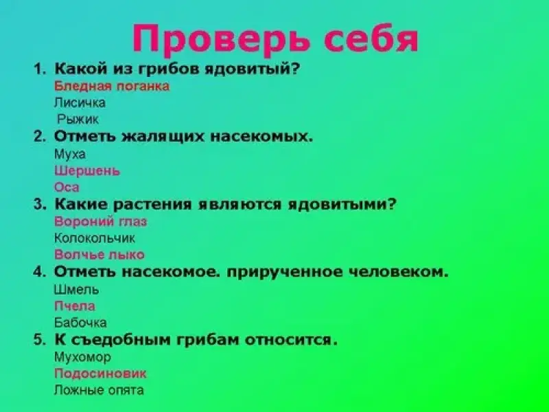 Расширить знания учащихся о лекарственных и ядовитых растениях; о съедобных и несъедобных грибах и ягодах. Формировать знания об экологической целостности природы; интерес к познанию природы, выработать правила поведения в лесу, как защитить себя от укуса жалящего насекомого, познакомиться с памяткой из энциклопедии по осторожному обращению с незнакомыми растениями. |