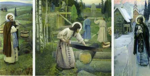 Искусствовед рассказывает о триптихе (три картины, объединенные общим замыслом) М.В.Нестерова "Труды С.Радонежского".