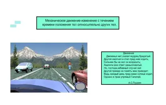 1. Начинаем урок с объявления новой темы урока и попробуем ответить на вопрос: «Что нам позволяет судить о том, движется тело или покоится?». После ответов учащихся цитируем отрывок стихотворения