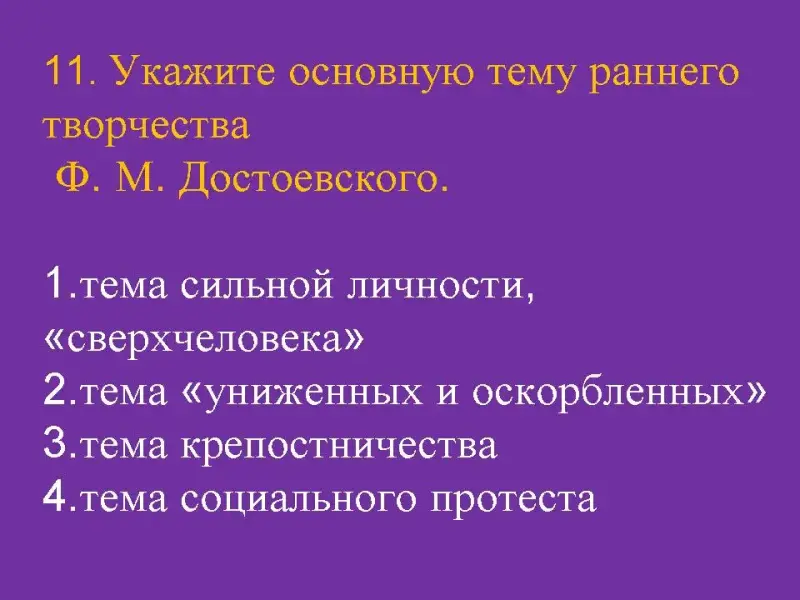 11. Укажите основную тему раннего творчества Ф. М. Достоевского.