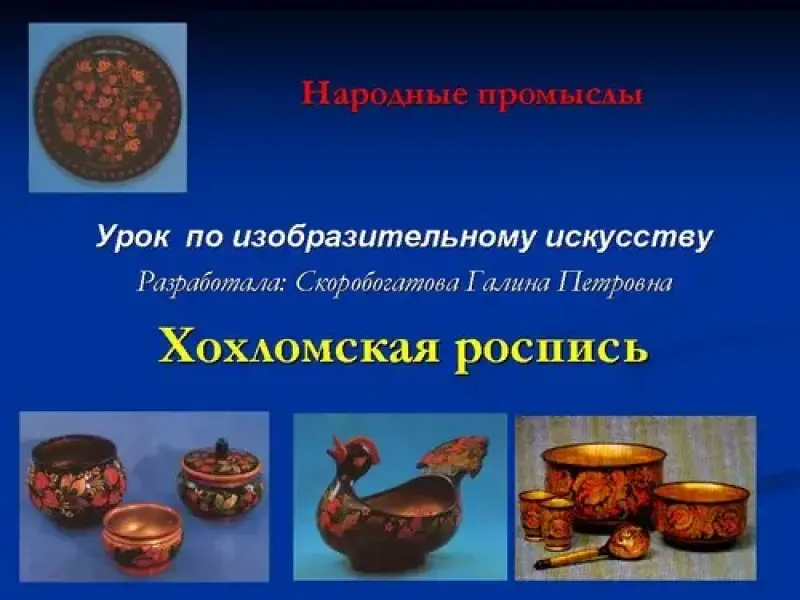 Цель: Познакомить учащихся с народным промыслом России - Хохлома, формировать навыки росписи в традициях народного промысла, владения приёмами и способами создания композиции, ритма завершённого образа.