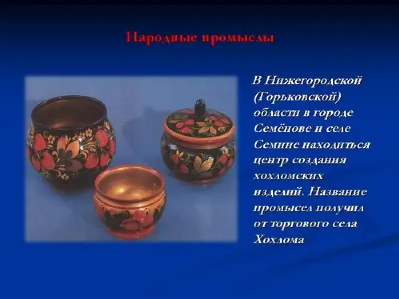 Сегодня мы познакомимся с известным промыслом не только в нашей стране но и далеко за её пределами, промысел этот называется "Золотая хохлома". Эта роспись по дереву золотым, красным, чёрным цветом появилась в 16 веке близ Городца в сёле Хохлома, в Нижегородской (Горьковской) области в городе Семёнове и селе Семине находиться центр создания хохломских изделий. Название промысел получил от торгового села Хохлома. < слайд 2 >.