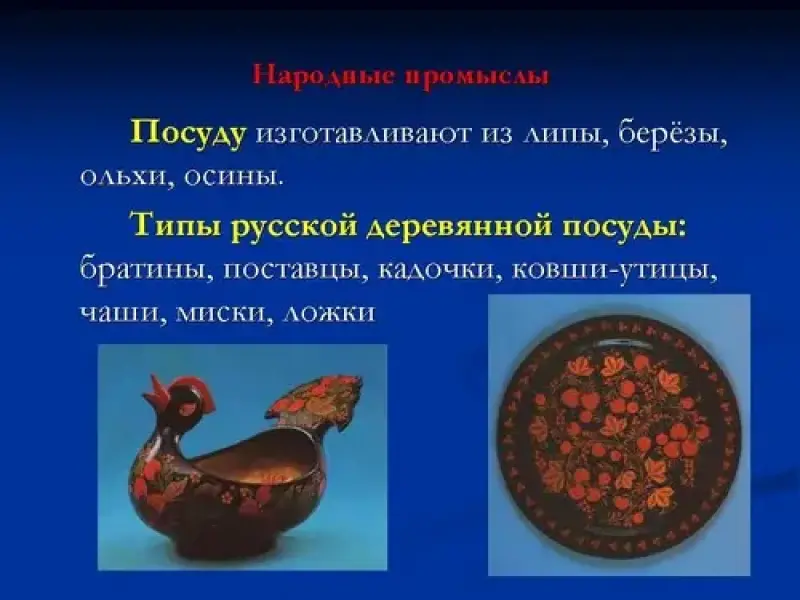 Изготавливалась посуда из липы, берёзы, осины. < слайд 3,4> . промысел как правило был семейным, каждому находилась работа мужчины точили заготовки посуды, Посуду деревянную сушили, затем женщины шпаклевали её белой глиной, грунтовали льняным маслом, посуду шлифовали что бы не было неровностей, а затем олифой натирали пока изделие не заблестит, только потом покрывали алюминиевым порошком. После того как заготовка прошла поэтапную подготовку к росписи её расписывали стойкими масляными красками - охрой, суриком, кармином, киноварью и сажей. Вы спросите, а золото то откуда? Оказывается изделие расписанное покрывалось лаком и прогревалось. Лак при нагреве приобретал золотистый блеск. Отсюда и золотое свечение посуды.