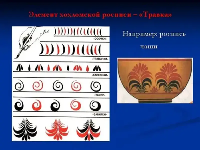 Роспись "травка" выполняется красным, чёрным цветом < слайд 6> создаётся из элементов осочки, травинки, капельки, усики, завитки. Все травинки, малые и большие, кудрявиться, не касаясь стебелька "криуля" < слайд 7> , или же собираются к одному общему "корешку".