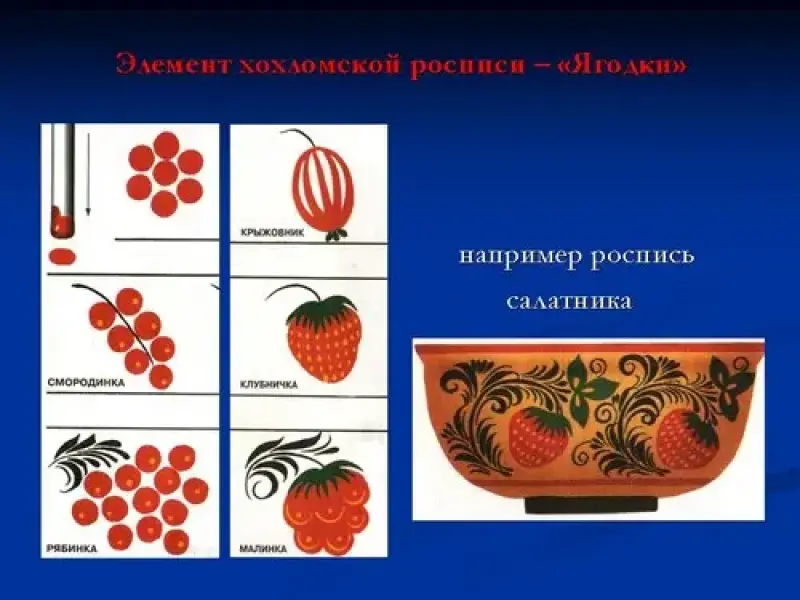 Часто в композиции среди изящных стеблей и листочков рассыпаны спелые ягоды <слайд № 8,9,10> малина, крыжовник, смородина, рябина и клубника а дополняют композицию цветок. Эту роспись назвали под листок или травка. Травка - главный мотив хохломской росписи. < слайд 11> есть у мастеров несколько приёмов росписи, один из них приём под фон. Сначала мастер досконально выводит рисунок на поверхности бытового предмета, затем заполняет фон красной или чёрной краской, при этом оставляя крупные листья и цветы серебристым цветом. Когда фон просохнет добавляются спелые красные ягоды, травная роспись, приписки зелёной и жёлтой краской. Изделие получается очень нарядное. Хохломская посуда ни воды, ни жара не боится. Как ты думаешь почему?