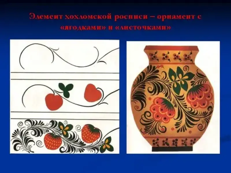 Главным мотивом хохломской росписи < слайд 5 > растительный узор, в основу которого легли стебли, завитки, кудрина, цветы, ягоды, листики. Внимательно присмотритесь что и как мастера делают. Они никогда точно не повторяют один и тот же рисунок.