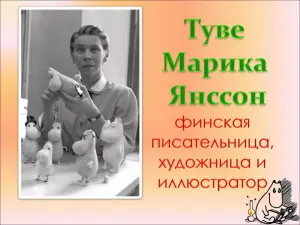 авторе этого произведения. Рассказ учителя об авторе – Когда твоя мама – художник, а папа – скульптор, жить довольно весело. Когда в доме почти всю ночь играет музыка, комнаты заполнены людьми... Когда дом бабушки стоит на огромной поляне в лесу... Тогда жизнь становится похожей на сказку, тогда можно найти огромный серебряный камень у железной дороги, можно иметь свой собственный айсберг, а ещё можно вырасти и придумать Муми-троллей... |