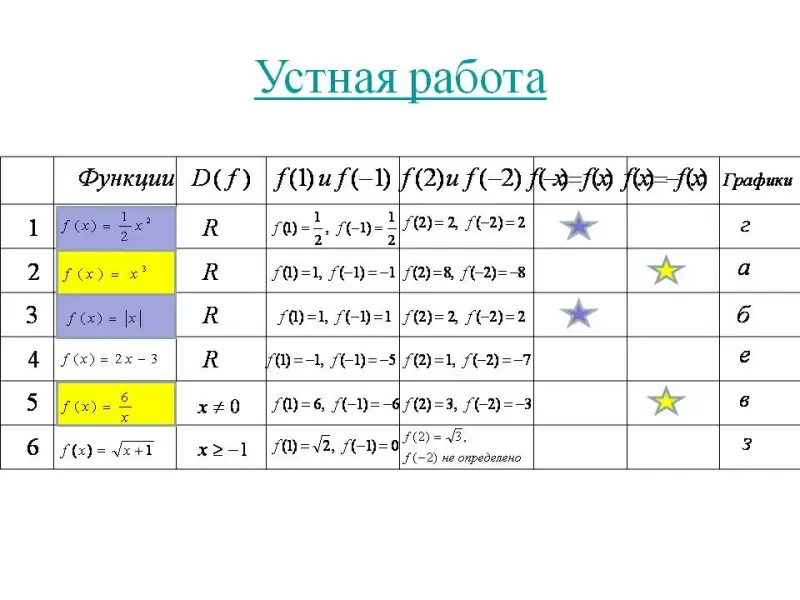 f(1) и f(- 1) f(2) и f(- 2) графики f(- х) = -f(х) f(- х) = f(х)