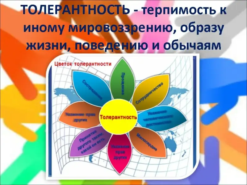 - Толерамнтность - социологический термин, обозначающий терпимость к иному мировоззрению, образу жизни, поведению и обычаям. Толерантность не равносильна безразличию, она заключается в представлении другим права жить в соответствии с собственным мировоззрением. Проявление толерантности также не означает терпимости к социальной несправедливости, отказа от своих убеждений, а также навязывания своих убеждений другим людям. Толерантность обеспечивает сохранение разнообразия, естественного права на отличность, непохожесть. 2 слайд