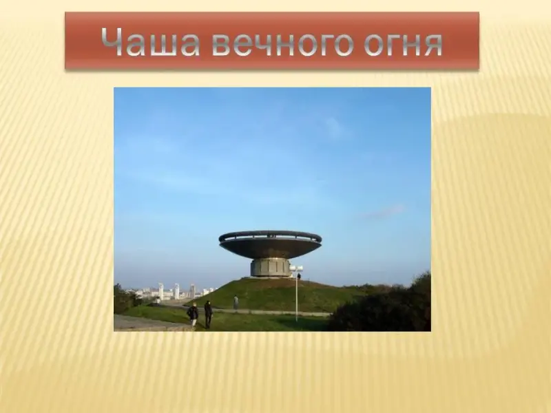 (слайд №12) Мы прогуляемся по проспекту и увидим рукотворный курган. На нем взметнулась ввысь 45-метровая стела, напоминающая по форме знамя. У ее подножия - текст о присвоении