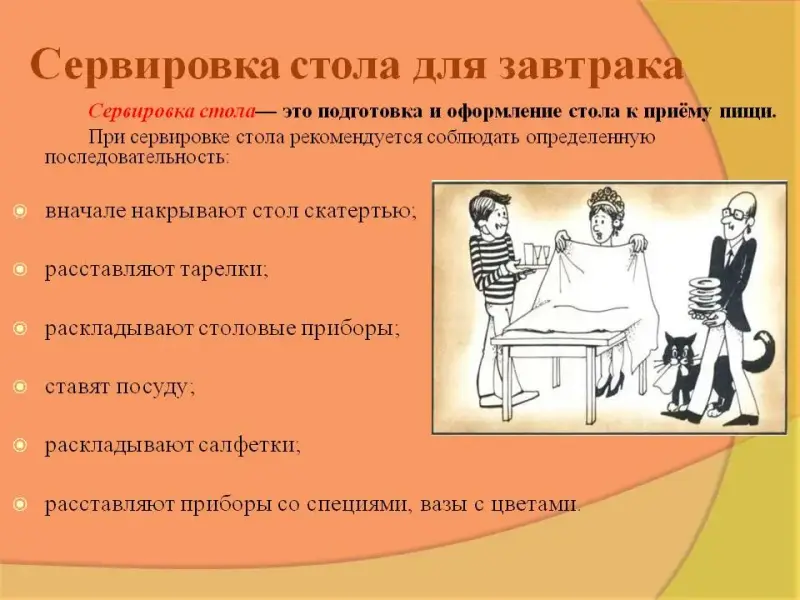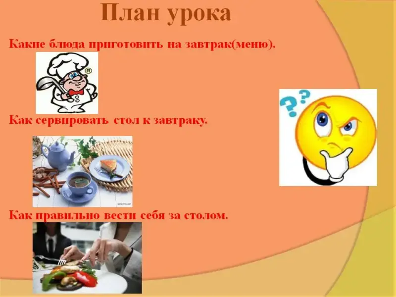 Цель урока: формирование знаний о составлении меню и сервировке стола к завтраку.