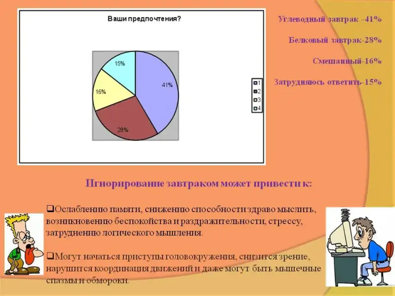 - Поднимите пожалуйста руку, кто сегодня завтракал? - А кто считает, что ваш завтрак был полноценным ? Если да, то почему? Дома вы провели опрос: Кто завтракает и какие продукты предпочитают на завтрак? Давайте вместе подведём итог собранной информации. (Слайды №4-5) Организует учащихся по исследованию проблемной ситуации. Вопрос: что такое калорийность продуктов? |