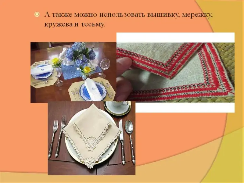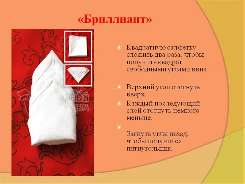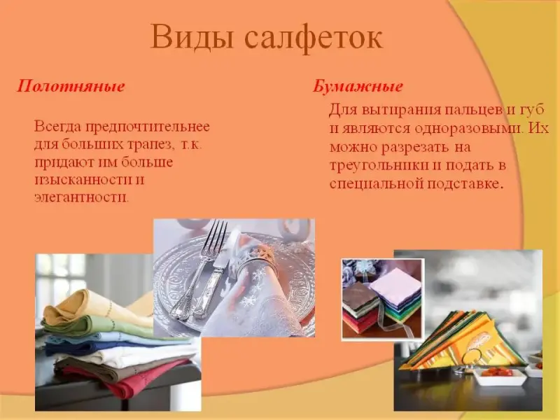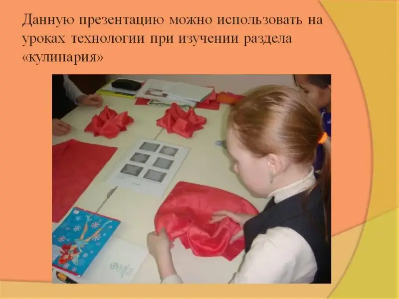 Оборудование: полотняные салфетки, инструкционные карты «Способы складывания салфетки», карточки с эскизами продуктов, столовые приборы, проектор, компьютер, презентация.