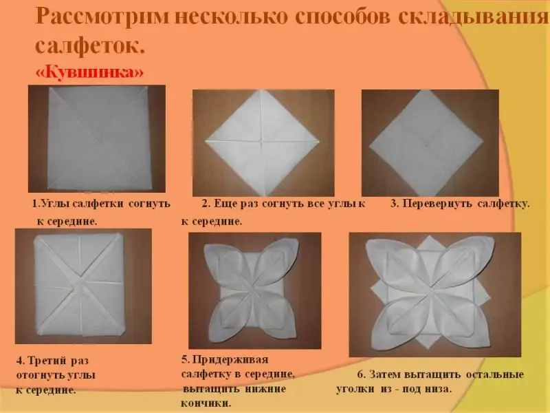 Коммуникативные: слушать и слышать собеседника. Познавательные: применять полученные знания о способах складывания салфеток. |