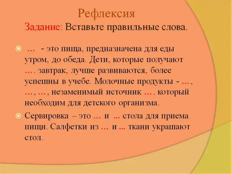 Давайте вернемся к м/ф. Кто же на самом деле был прав? Какие советы вы хотели бы дать нашим героям? Какова была ваша учебная задача? Чему вы научились на уроке? Где можно применить полученные знания ? Для чего нужно знать правила сервировки стола? Какие затруднения у вас возникли? Какие способы сложения салфеток вам понравились больше всего? Дайте анализ своей деятельности на уроке. Выполнить задание: в тексте вставить правильные слова. Учитель консультирует, формулирует выводы, подводит итог совместной и индивидуальной деятельности учеников, выставляет оценки за работу на уроке. |
