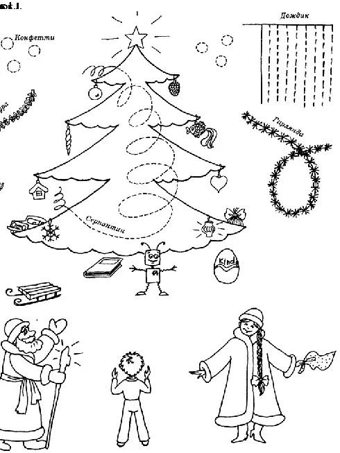 - Предметы: Новый год, праздник, елка, украшения, игрушки, гирлянда, мишура, серпантин, шары, макушка, веселье, подарки, хоровод, поздравления, Дед Мороз, Снегурочка.