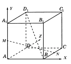 Положим начало координат в точке A. Выберем оси координат как показано на рисунке. Точки M, N, B, D1 имеют координаты M(0;0;1), N(2;1;0), B(2;0;0),