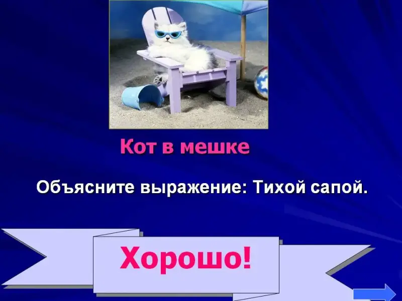 Все вопросы поделены на 3 блока, каждый блок содержит 5 заданий. В игре есть вопрос "Кот в мешке". Работа оформлена в виде Презентации. Слайд 2 - основной, с остальными слайдами, на которых написаны задания, работают по гиперссылкам по щелчку мыши. Чтобы вернуться к слайду 2, необходимо нажать на стрелку. На основном слайде кликать на цифру только тогда, когда появляется рука.