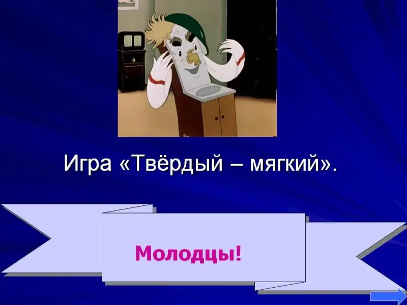 2. Игра «Твёрдый - мягкий». Если в словах слышится твёрдый звук - встаём, если мягкий - сидим. (Кнут, гнуть, тихо, просить, тени, Таня, тигр, ток, тюк, ты, тут, тянут). По ходу идёт работа над пониманием значения некоторых слов. Помогают «научные сотрудники».