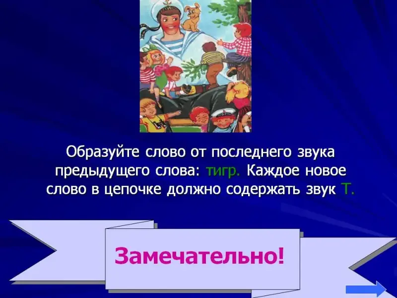 3. Образуйте слово от последнего звука предыдущего слова: тигр. Каждое новое слово в цепочке должно содержать звук Т.