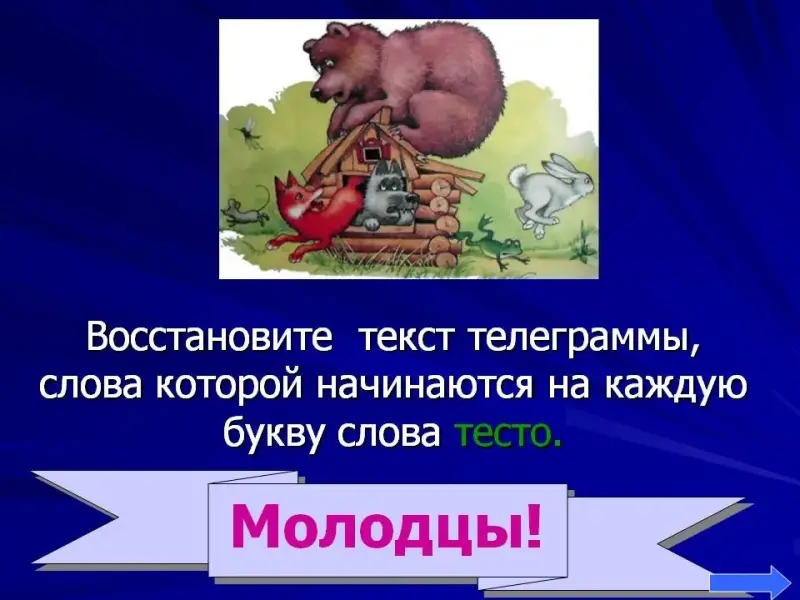 3. Восстановите текст телеграммы, слова которой начинаются на каждую букву слова тесто.