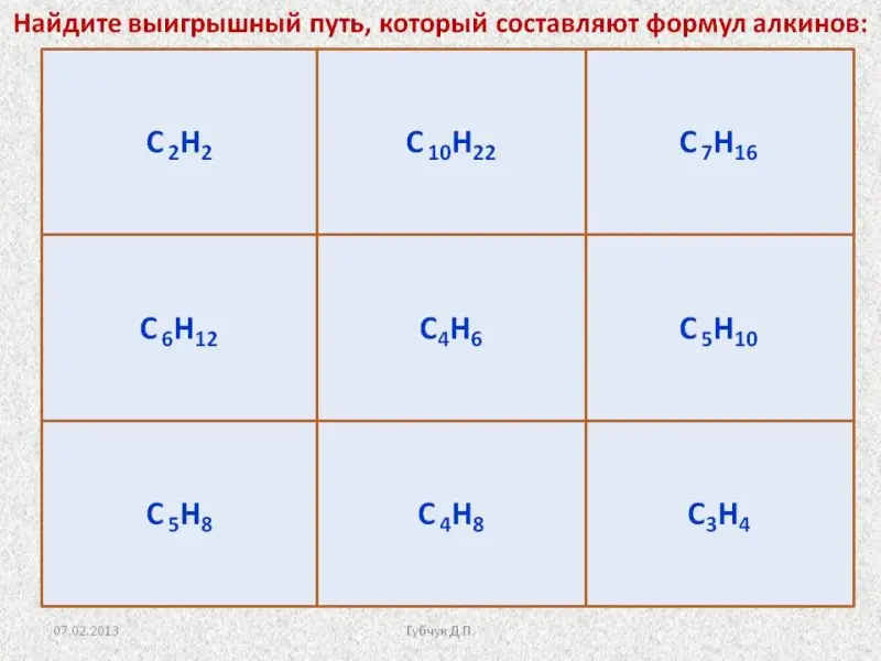 | 4. Закрепление знаний | Предлагает найти выигрышный путь, определив формулы гомологов ацетилена (Слайд 24). | Определяют выигрышный путь, называя формулы алкинов. |