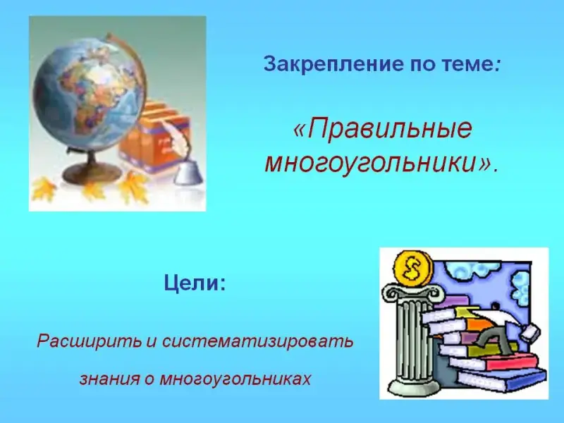 - Образовательная: создать условия для закрепления учащимися основных формул (вычисления площадей и сторон правильных многоугольников; радиусов вписанных и описанных окружностей) и применения этих формул для решения практических задач.