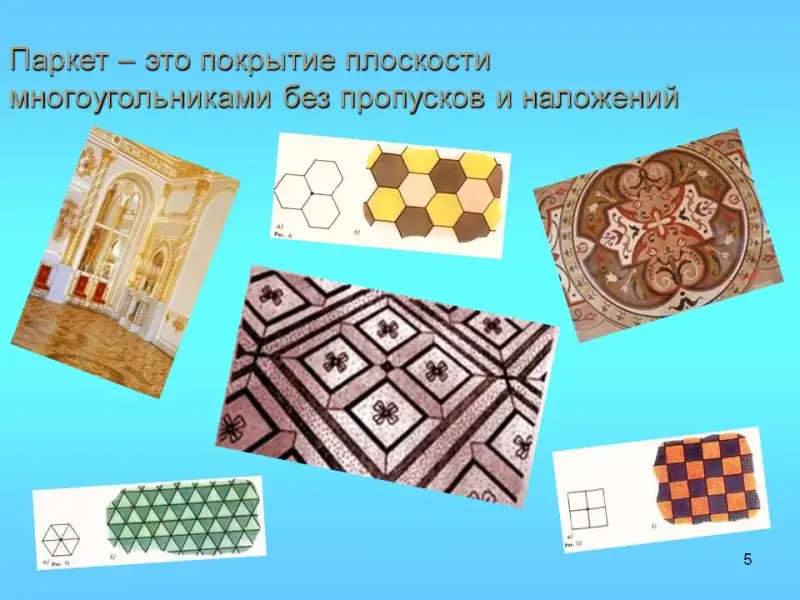 1) Паркет - это покрытие плоскости многоугольниками без пропусков и наложений.