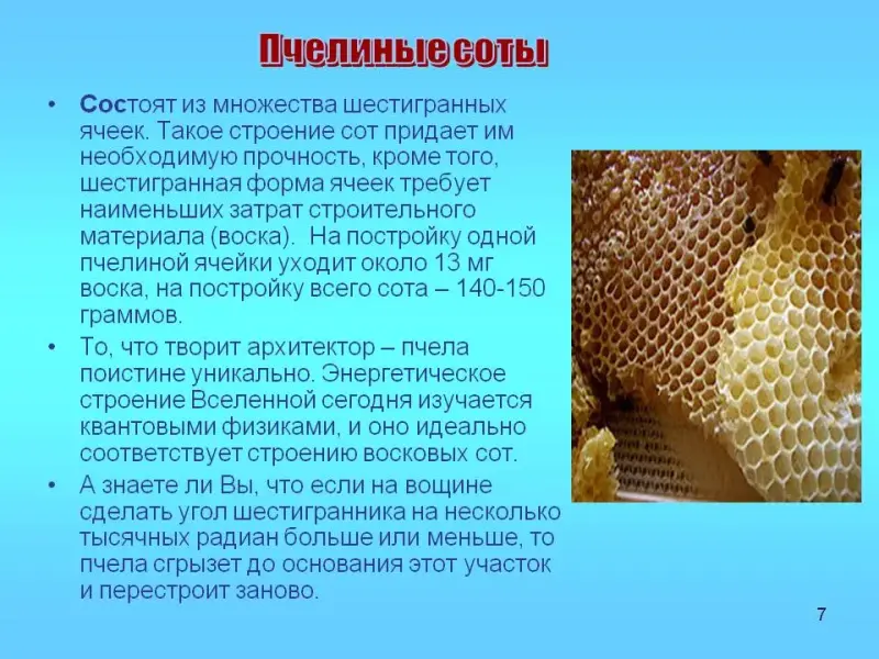 - То, что творит архитектор - пчела поистине уникально. Энергетическое строение Вселенной сегодня изучается квантовыми физиками, и оно идеально соответствует строению восковых сот.