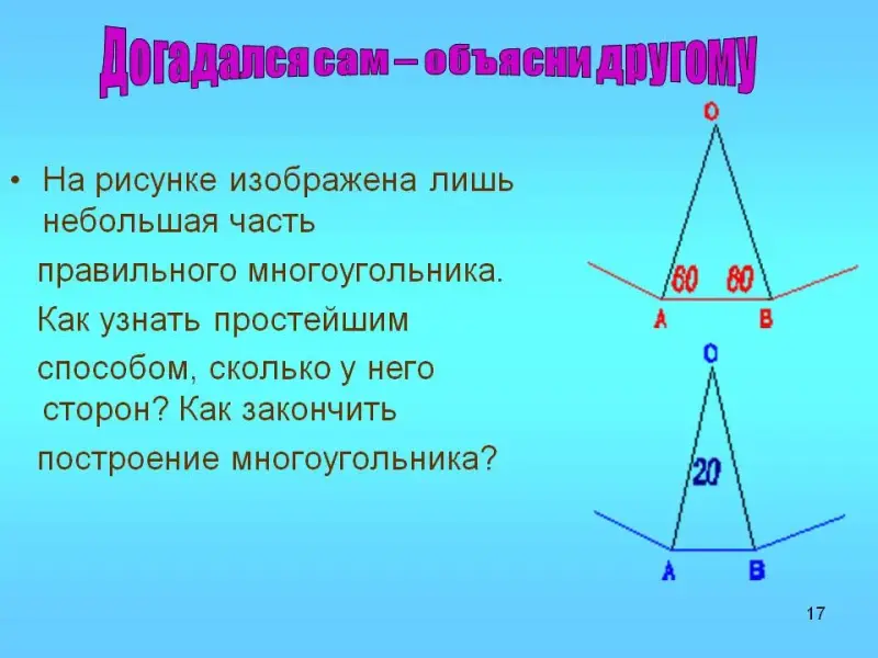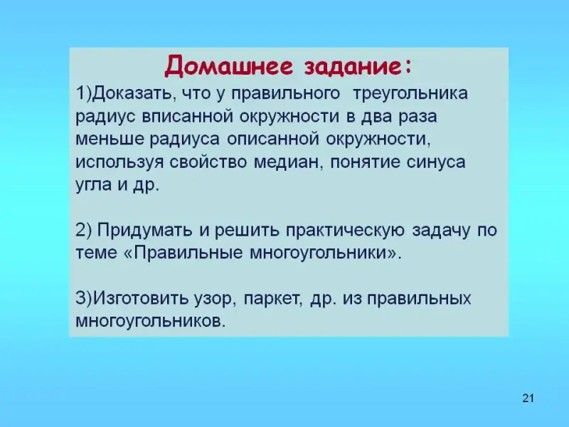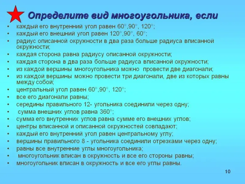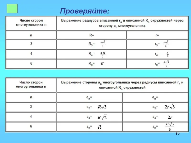 «Для всех правильных многоугольников»: центры вписанной и описанной окружностей совпадают; сумма внешних углов 360°; каждый внутренний угол равен центральному; равны все внутренние углы