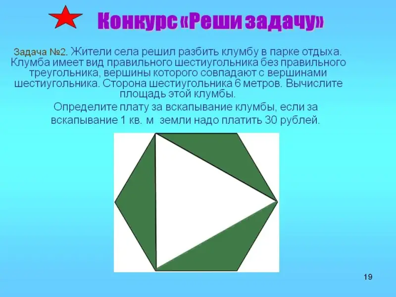 Задача №2. Жители села решил разбить клумбу в парке отдыха. Клумба имеет вид правильного шестиугольника без правильного треугольника, вершины которого совпадают с вершинами шестиугольника. Сторона шестиугольника 6 метров. Вычислите площадь этой клумбы. Определите плату за вскапывание клумбы, если за вскапывание 1 кв. м земли надо платить 30 рублей. (7 баллов)