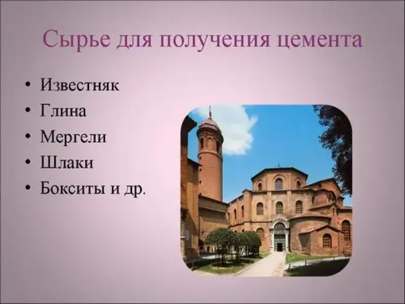 Основное сырье: известняк и глина, содержащие оксид кремния (IV), маргелистые породы, а также различные добавки - шлак, бокситы и др.