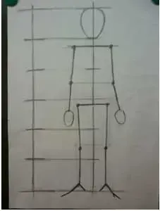 Учитель: Определяю общее расположение на плоскости листа бумаги. Провожу линию, определяющую движение фигуры, ее характер. На ней отмечаю основные пропорциональные отношения головы, шеи, груди, таза, рук, ног. Далее прорисовываю очертания всех основных частей фигуры школьника.