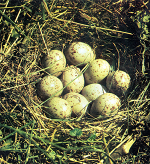 Вот эта птица.(Демонстрация изображения коростеля) (Рисунок 1) Скромное оперение, небольшая по размеру. А это кладка в гнезде.(Демонстрация гнезда с кладкой ) (Рисунок 2) Птицы вьют его на земле, маскируют в траве. Если вы идете по полю или опушке, то необходимо внимательно смотреть под ноги, чтобы не наступить случайно на гнездо этой птички.