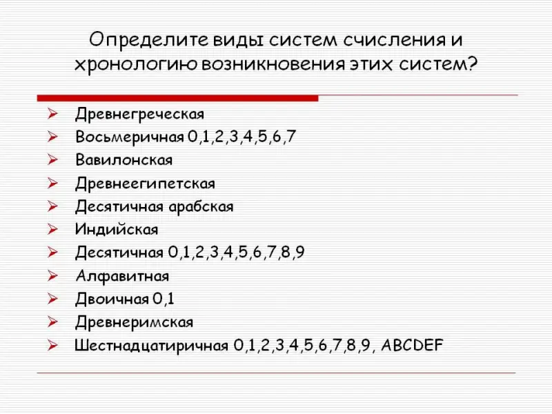 - Посмотрите на доску и определите виды систем счисления и хронологию их появления (Приложение 1, флипчарт №3). Переместите в нужные столбцы соответствующие СС.