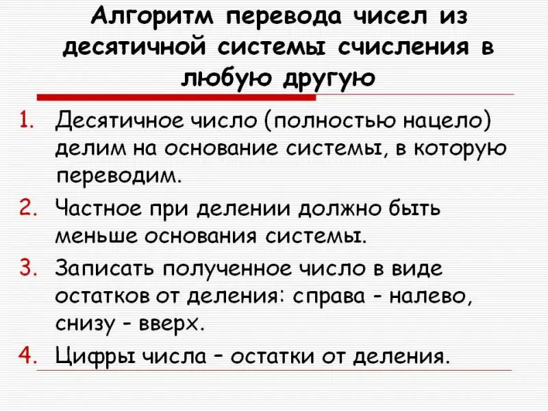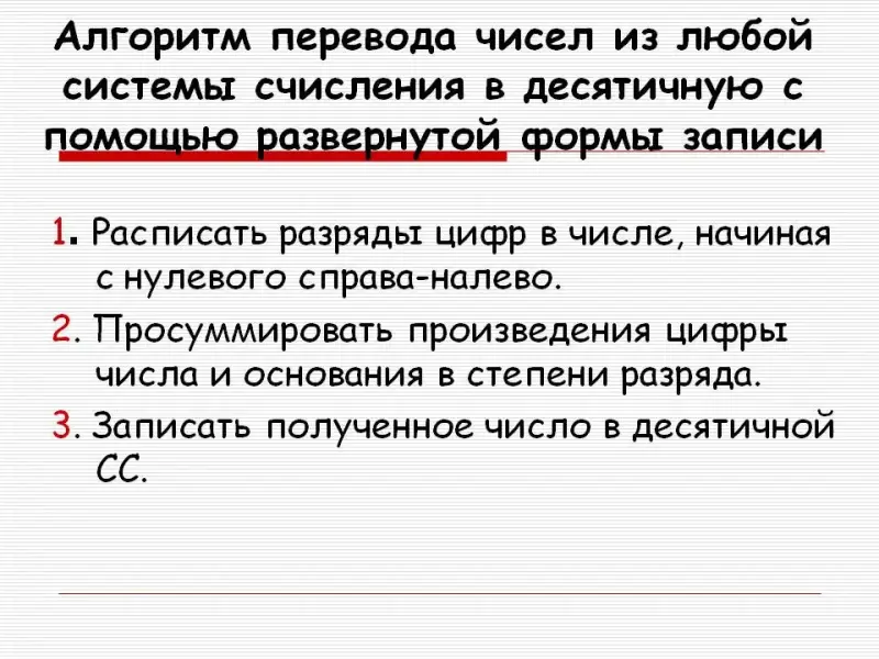 - составить алгоритм перевода чисел из любой системы счисления в десятичную и наоборот;