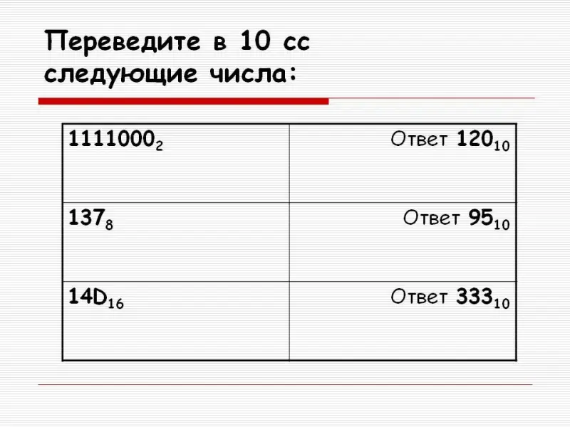 | Проверка знаний предыдущего урока и подготовка к новому материалу | Активизировать мыслительную деятельность учащихся, проверить знания. Развить интерес к изученной теме. | Проверка и разбор домашних примеров. Разбор новых задач на перевод чисел. Знакомство с новыми понятиями. |