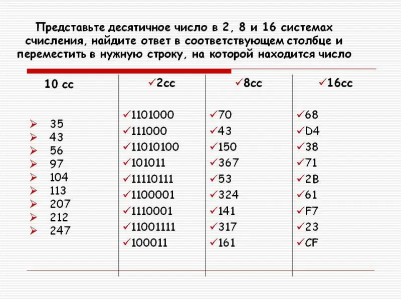 С помощью интерактивной доски показать на примерах перевод чисел и связь между разными системами счисления. Активировать флипчарт №6 и раздать каждому учащемуся по 1 примеру для перевода из 10сс в 2сс, 8сс и 16сс. После того как будет переведено число, каждый ученик, подойдя к интерактивной доске, перетаскивает в нужную строку свои ответы. Если ответ неверен, он автоматически возвращается на исходную позицию и ждет повторного действия. Каждый обучающийся получает оценку за свою работу.