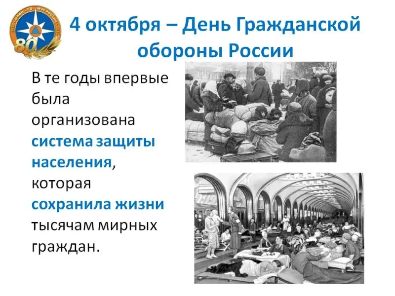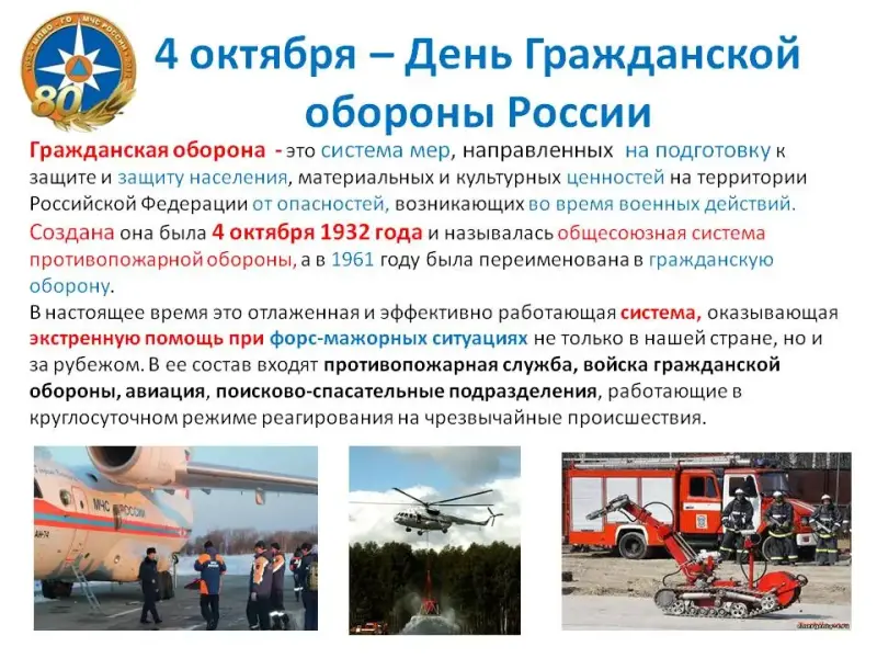Создана она была 4 октября 1932 года и называлась общесоюзная система противопожарной обороны, а в 1961 году была переименована в гражданскую оборону.