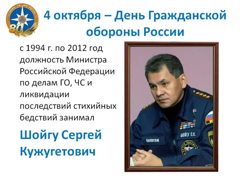 с 1994 г. по 2012 год должность Министра Российской Федерации по делам ГО, ЧС и ликвидации последствий стихийных бедствий занимал Шойгу Сергей Кужугетович