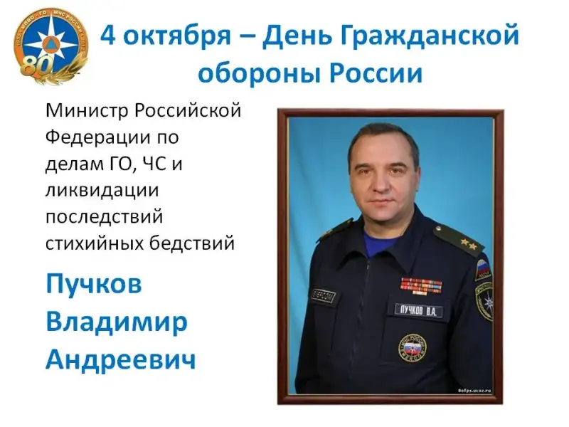 Министр Российской Федерации по делам ГО, ЧС и ликвидации последствий стихийных бедствий Пучков Владимир Андреевич.