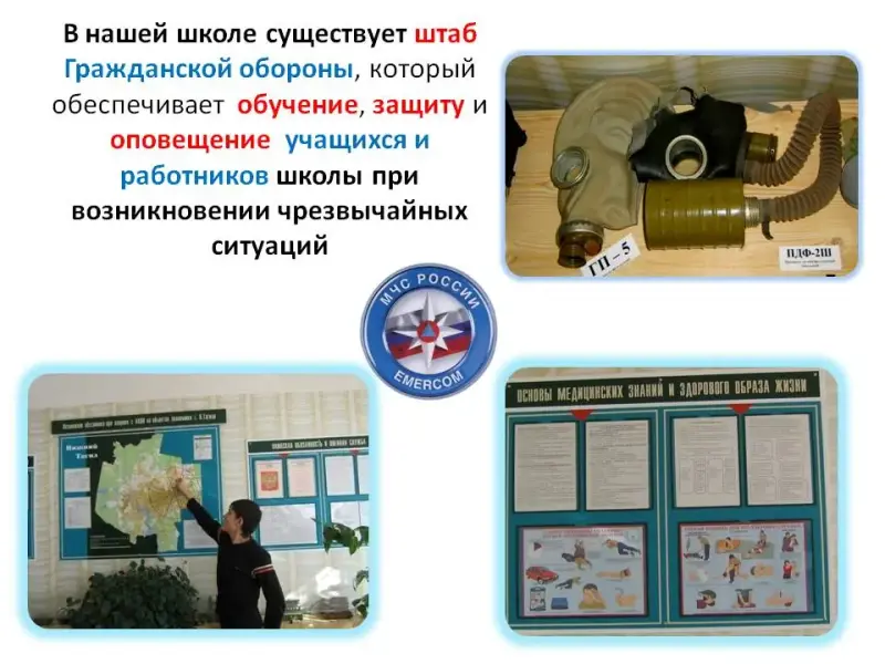 В нашей школе существует штаб Гражданской обороны, который обеспечивает обучение, защиту и оповещение учащихся и работников школы при возникновении чрезвычайных ситуаций